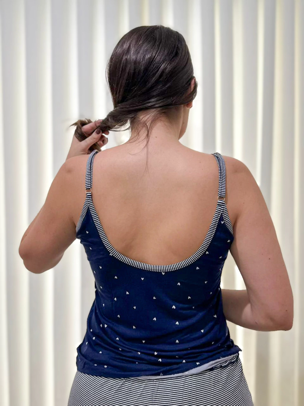 Pijama Azul Marinho Coração – o match perfeito entre conforto e fofura para suas noites! Feito de algodão fresquinho, com alças reguláveis para aquele ajuste personalizado. A estampa de coração no top dá um charme extra, enquanto o shorts listrado com bolso é puro estilo e praticidade. Ah, e tem modelo infantil igualzinho pra arrasar no look tal mãe, tal filha! Dormir nunca foi tão divertido!